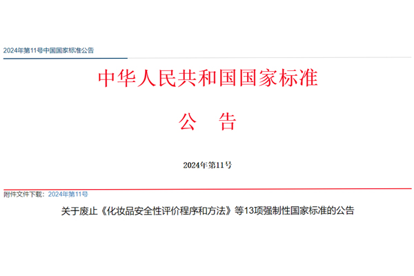近日,2024第11號國家標(biāo)準(zhǔn)公告發(fā)布,國家市場監(jiān)督管理總局(國家標(biāo)準(zhǔn)化管理委員會)廢止《化妝品安全性評價程序和方法》等13項(xiàng)強(qiáng)制性國家標(biāo)準(zhǔn)